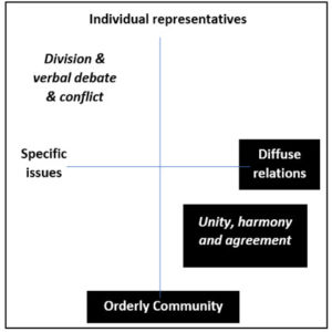China daarentegen vertrouwt op eenheid, harmonie en overeenstemming. Die vindt plaats in het kader van diffuse relaties binnen een ordelijke gemeenschap. Meer ruimte voor het bespreken van conflicten zal de consensus diepgaand en langdurig beïnvloeden. Ik illustreer dat met een grafiek uit een van mijn publicaties: