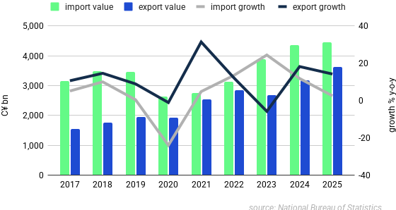 De waarde van de Chinese export van diensten (zie ook de illustratie bij dit artikel) in 2025 bedroeg RMB 3,63 biljoen; een stijging van 14,2%. De waarde van de geïmporteerde diensten bedroeg RMB 4,46 biljoen; een stijging van 2.5%. De waarde van China’s total export in dat jaar was RMB 45,47 biljoen. Dat betekent dat het aantal van diensten (export + import) daarin slechts 17,79% was.