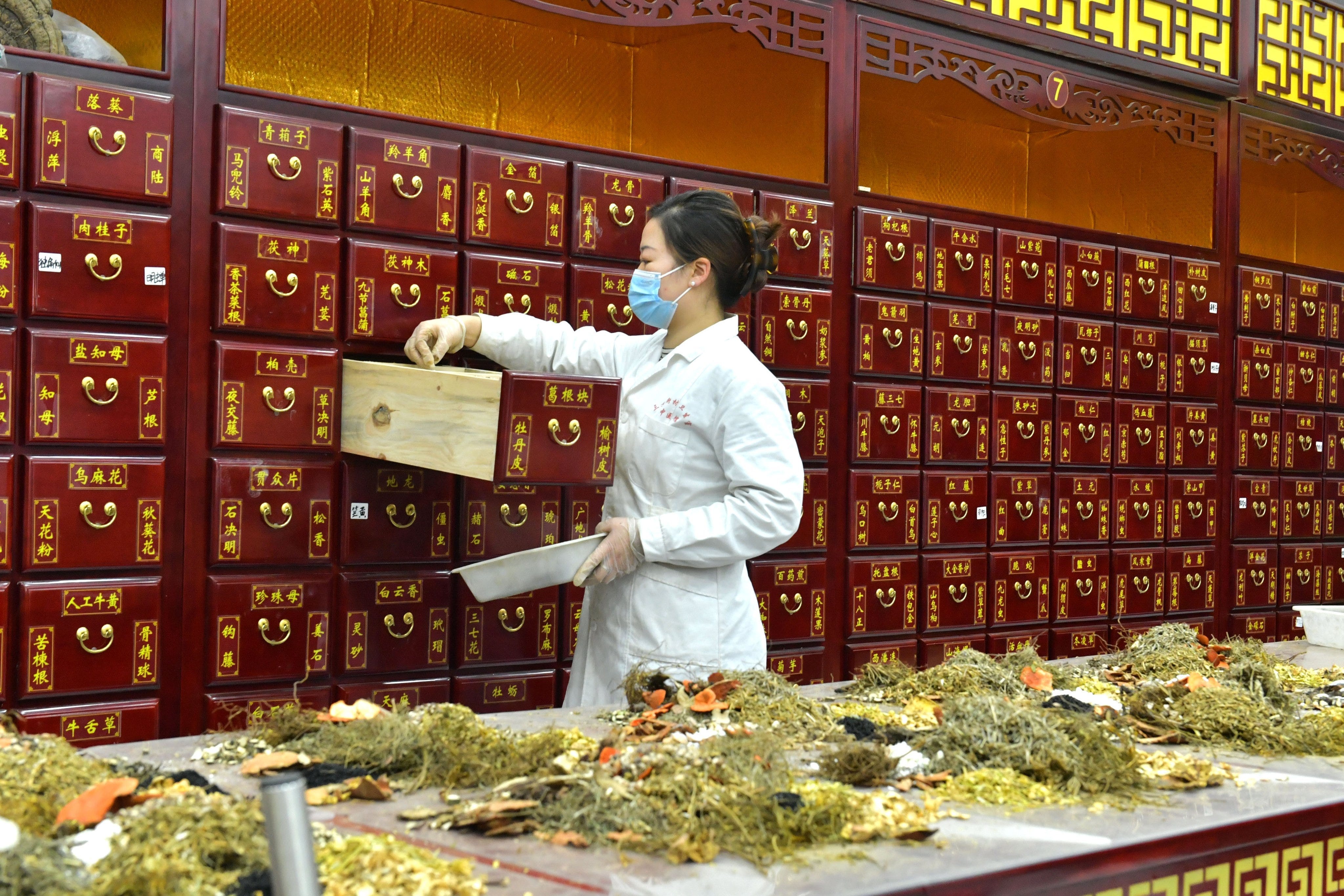 Een typische TCM-medicijnkast telt al snel tussen de 100 en 400 lades. Op elk label staat meer dan alleen de naam van een kruid. De eerste tekens geven vaak de categorie aan — het balanceren of versterken van de qi, de ‘levensenergie’ (补气), hitte verdrijven en vocht in balans houden (清热), of de bloedsomloop stimuleren (活血). Daaronder volgt de eigenlijke naam van het ingrediënt: ren shen (人参, ginseng), huang qi (黄芪, astragalus), dang gui (当归, engelwortel). Soms staat er ook een inventarisnummer op het label, voornamelijk voor leerlingen in opleiding.