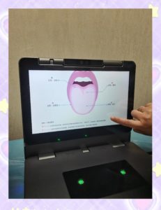 Een tweede essentieel lichaamsdeel in de traditionele Chinese diagnose is de tong. In China wordt de tong ook wel de ‘spiegel van het lichaam’ genoemd. Een Chinese arts kijkt naar de kleur, de papillen, de dikte, enz., van de tong en kan daaruit diverse aspecten van de gezondheid van een patiënt afleiden. Verschillende posities op de tong zijn met bepaalde organen verbonden en kunnen inzicht geven in de status van dat orgaan. Chinese onderzoekers hebben een apparaat ontwikkeld dat de boven- en onderkant van de tong fotografeert en die foto’s vervolgens analyseert.