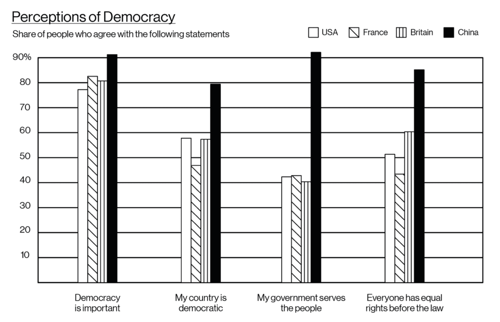 Het AoD-onderzoek peilt ook naar de perceptie die mensen hebben van vrijheid van meningsuiting en vrije en eerlijke verkiezingen. Ook hier presteert China beter dan de VS en het grootste deel van Europa. Met de stelling ‘Iedereen in mijn land kan vrij zijn mening geven over politieke en sociale onderwerpen’ was slechts 18% van de mensen in China het oneens (vergeleken met 27% in de VS). En met de stelling ‘Politieke leiders in mijn land worden gekozen in vrije en eerlijke verkiezingen’ was slechts 5% in China het oneens (vergeleken met 27% in de VS).
