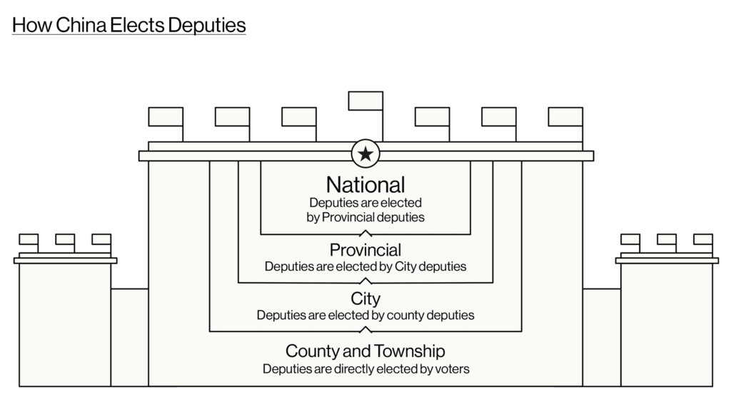 Op county-level(县级) – arrondissementsniveau – zijn er County People’s Congresses, lokale volkscongressen ondersteund door plaatselijke CPPCC-comités (adviescomités), en gespecialiseerde comités voor landbouw, industrie, onderwijs en andere gebieden en openbare hoorzittingen over belangrijke onderwerpen. Op het niveau van de prefectuur/stad(地市级) zijn er Municipal People’s Congresses, gemeentelijke volkscongressen en hun permanente comités, gemeentelijke CPPCC-comités, sectorspecifieke raadplegingsmechanismen en brede inspraak bij stadsplanning en -ontwikkeling. Op provinciaal niveau (省级) zijn er Provincial People’s Congresses, provinciale volkscongressen en hun permanente comités, provinciale CPPCC-comités, interregionale coördinatiemechanismen en beleidsoverlegprocessen met academische instellingen en denktanks. Nadat het volk vertegenwoordigers heeft gekozen op het niveau van de gemeentes en de arrondissementen, kiezen die vertegenwoordigers op hun beurt afgevaardigden op hogere bestuursniveaus (zie figuur 1).