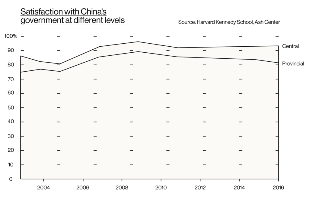 Hier geven we gegevens weer van verschillende grote onderzoeken. Ten eerste heeft het Harvard University Ash Center for Democratic Governance and Innovation sinds 2003 de meest uitgebreide onafhankelijke beoordeling van de tevredenheid van Chinese burgers over de prestaties van de overheid bijgehouden. Het rapport van 2020, ‘Understanding CCP [sic] Resilience: Surveying Chinese Public Opinion Through Time’, liet zien dat er onder de bevolking brede steun is voor de Chinese regering op alle niveaus. De auteurs van het onderzoek werkten binnen een analytisch kader dat aanvankelijk veronderstelde dat het autoritaire karakter van het Chinese systeem zou leiden tot een ernstige verkleining van het draagvlak. In plaats daarvan stelden ze een consistente toename in tevredenheid bij de burgers vast. De tevredenheid over de centrale overheid bereikte 93% in 2016, terwijl 82% van de respondenten hun steun bleven uitspreken voor de provinciale overheden – met consistente stijgingen in de loop van de tijd (zie figuur 2). Dat gemarginaliseerde bevolkingsgroepen in economisch achtergestelde regio’s in het binnenland bij het onderzoek een verhoudingsgewijs grotere toename in tevredenheid lieten blijken is veelzeggend. Zoiets geeft aan dat de staat werk maakt van betere materiële omstandigheden en het lijkt een belangrijke factor in de vorming van het draagvlak. Dat bevestigt de opvatting die in China leeft over wat de functie van een integrale volksdemocratie moet zijn en effectief is. (30)