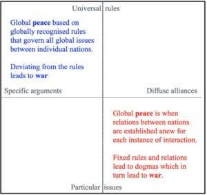 Vanuit een westers perspectief berust een echt vreedzame wereld op universeel erkende regels. Over deze regels wordt achtereenvolgend onderhandeld, één kwestie per keer, en zodra er overeenstemming is bereikt, wordt verdere discussie vaak als onnodig of zelfs ongewenst beschouwd. Veel wereldwijde instellingen, waaronder de Verenigde Naties en hun verschillende agentschappen, zijn op basis van deze logica ontworpen en gestructureerd.