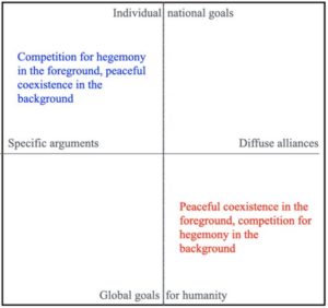 Dit verschil kan verder worden geïllustreerd door een matrix die de culturele dimensies individualisme – communitarianisme en specifiek – diffuus combineert. In de westerse perceptie streven staten grotendeels individuele nationale doelen na. Omdat deze doelen elkaar vaak overlappen, komen botsingen vaak voor – variërend van diplomatieke wrijving tot gewapende conflicten. Hoewel oorlog over het algemeen niet het voorkeursmiddel is om conflicten op te lossen, houden staten krachtige legers aan om hun kracht te tonen en potentiële tegenstanders af te schrikken. Zodra de oorlog echter uitbarst, kan deze snel escaleren tot grootschalige conflicten en soms zelfs een wereldoorlog.