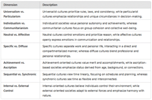 Trompenaars’ model van de nationale cultuur identificeert zeven belangrijke dimensies waarlangs culturele perspectieven verschillen: universalisme versus particularisme; individualisme versus communitarianisme; neutraal versus affectief; specifiek versus diffuus; prestatie versus toeschrijving; sequentieel versus synchroon; en interne versus externe controle. Zie het artikel ‘It’s culture, stupid!’ voor een nadere uitleg van de dimensies.