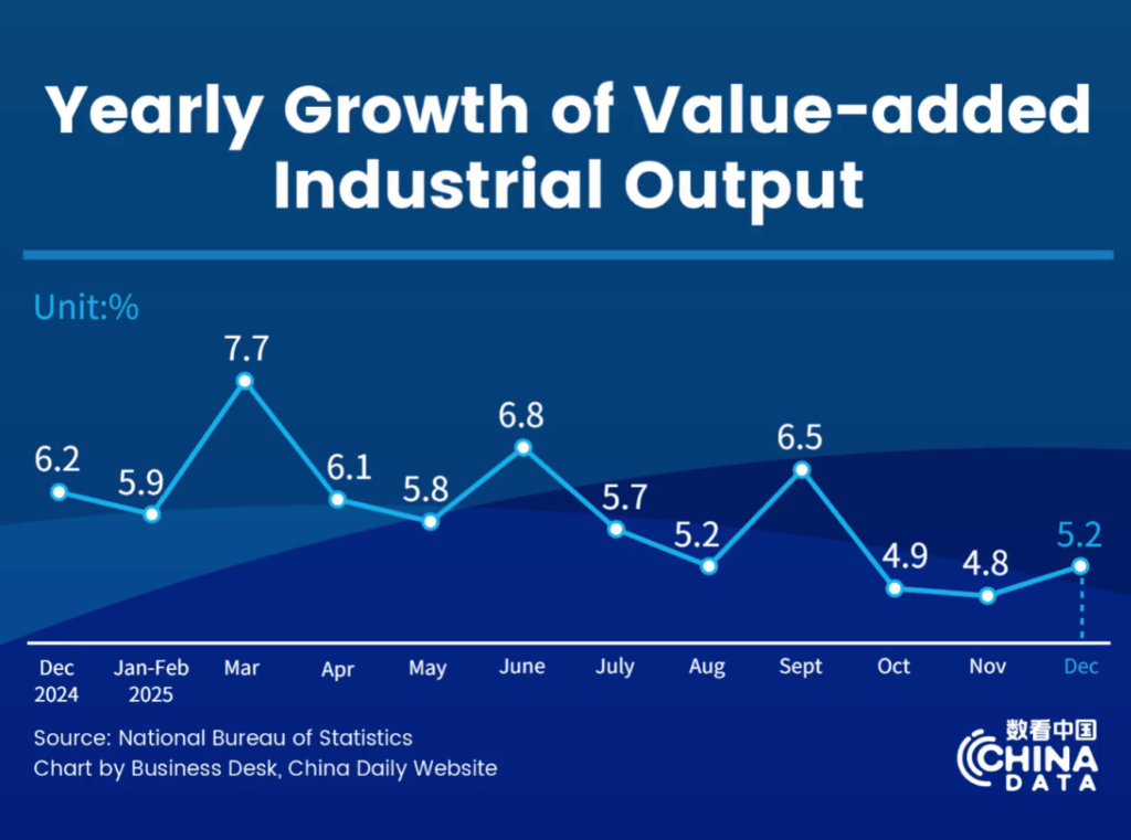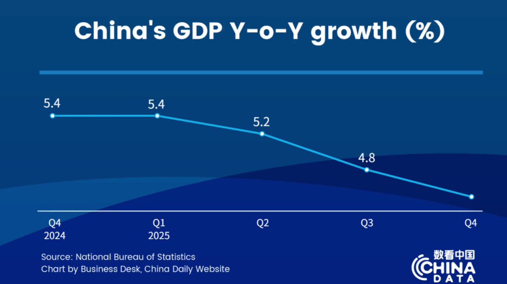 In het vierde kwartaal steeg het Chinese bruto nationaal product (bnp) met 4,5 % ten opzichte van dezelfde periode in 2024. Het bnp van het land groeide met 5,4 % in het eerste kwartaal, 5,2 % in het tweede kwartaal en 4,8 % in het derde kwartaal op jaarbasis, zo blijkt. In 2025 steeg de industriële productie met toegevoegde waarde met 5,9 % ten opzichte van dezelfde periode in 2024, terwijl de investeringen in vaste activa met 3,8 % daalden op jaarbasis. De detailhandelsverkopen van consumptiegoederen in China namen vorig jaar toe met 3,7 % op jaarbasis..