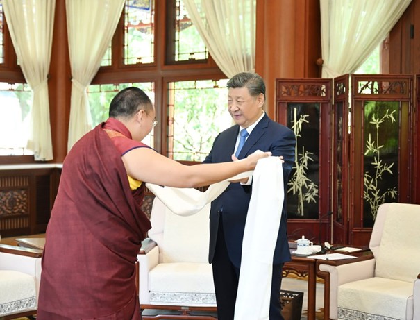 De 11e Panchen Lama overhandigt president Xi Jinping een traditionele Tibetaanse ceremoniële sjaal tijdens hun juni ontmoeting te Beijing Foto Xinhua Disclaimer