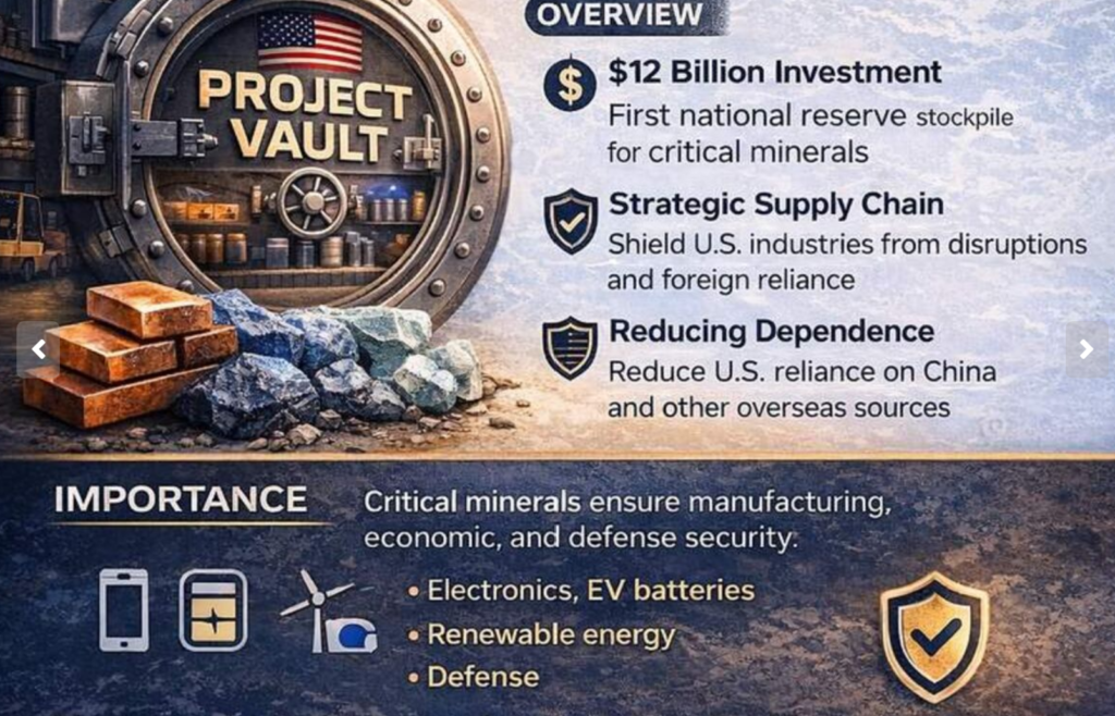 Naar analogie met de petroleumreserve wil de VS zelf ook een reserve van kritische grondstoffen aanleggen die de naam ‘The Vault’ meekreeg. De Amerikaanse Export-Import Bank (Exim) zal $ 10 miljard aan schuldfinanciering verstrekken voor het dit Project Vault om in de hele VS binnenlandse voorraden van ‘essentiële grondstoffen’ op te bouwen waar fabrikanten gebruik van kunnen maken. Nog eens $ 2 miljard dollar zal afkomstig zijn van privé kapitaal.. Doel is de aankoop van belangrijke mineralen. De VS hebben al een defensievoorraad van bepaalde belangrijke metalen, waaraan vorig jaar voor minstens $ 1 miljard aan grondstoffen is toegevoegd. Meer dan een dozijn bedrijven, waaronder Lockheed Martin, General Motors, Alphabet’s Google en batterijfabrikant Clarios hebben zich al aangemeld om lid te worden van the Vault. Zij betalen een vergoeding die hen het recht geeft om in noodsituaties mineralen uit de voorraad te halen wanneer zij moeite hebben om de materialen op de open markt te vinden.. The Vault is van plan strategische opslagplaatsen op te bouwen die ongeveer 60 dagen aan materiaal kunnen bevatten en zal beslissen welke mineralen worden aangekocht.